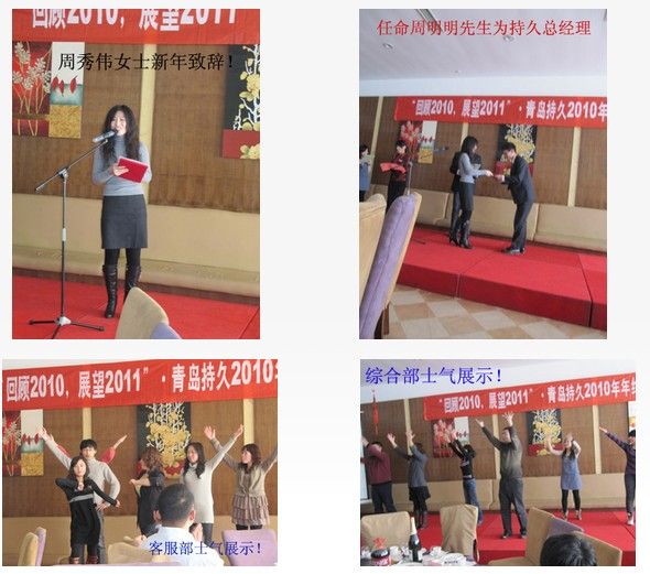 借著本次年終會的機會,持久想告訴大家:“回顧2010,感謝你們堅定相隨,與持久攜手并肩”“展望2011,期冀我們不離不棄,與持久共同成長”本次年終會以各種舞蹈歌曲、小品相聲和抽獎等形式出現(xiàn),同時節(jié)目進(jìn)行評選和頒獎。同時公布2011年青島持久碳業(yè)有限公司的人事任命。持久總經(jīng)理的任命,是持久2011年的頭等大事。相信在總經(jīng)理周明明的帶領(lǐng)下,持久會有更美好的明天。
